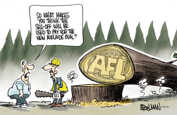 05.07.11 by Broelman Cartoon for Mt. Gambier’s Border Watch The SA government announces a sell-off of the South East timber plantations worth $500M the same time the new $500M Adelaide Oval 450 kms away gets the nod. Share this:TweetLike Loading...