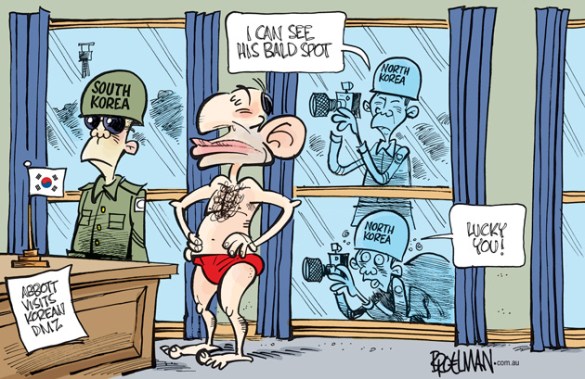 04.10.14 by Broelman Abbott’s North Korean bald spot Tony Abbott gets the back of his head photographed by a North Korean soldier looking through a window during a tour of the de-militarized zone between the two Koreas. But wait there’s more…. Share this:TweetLike Loading...